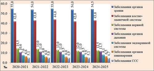 | Нозология | 2020-2021 гг | 2021-2022 гг. | 2022-2023 гг. | 2023-2024 гг. | 2024-2025 гг. |