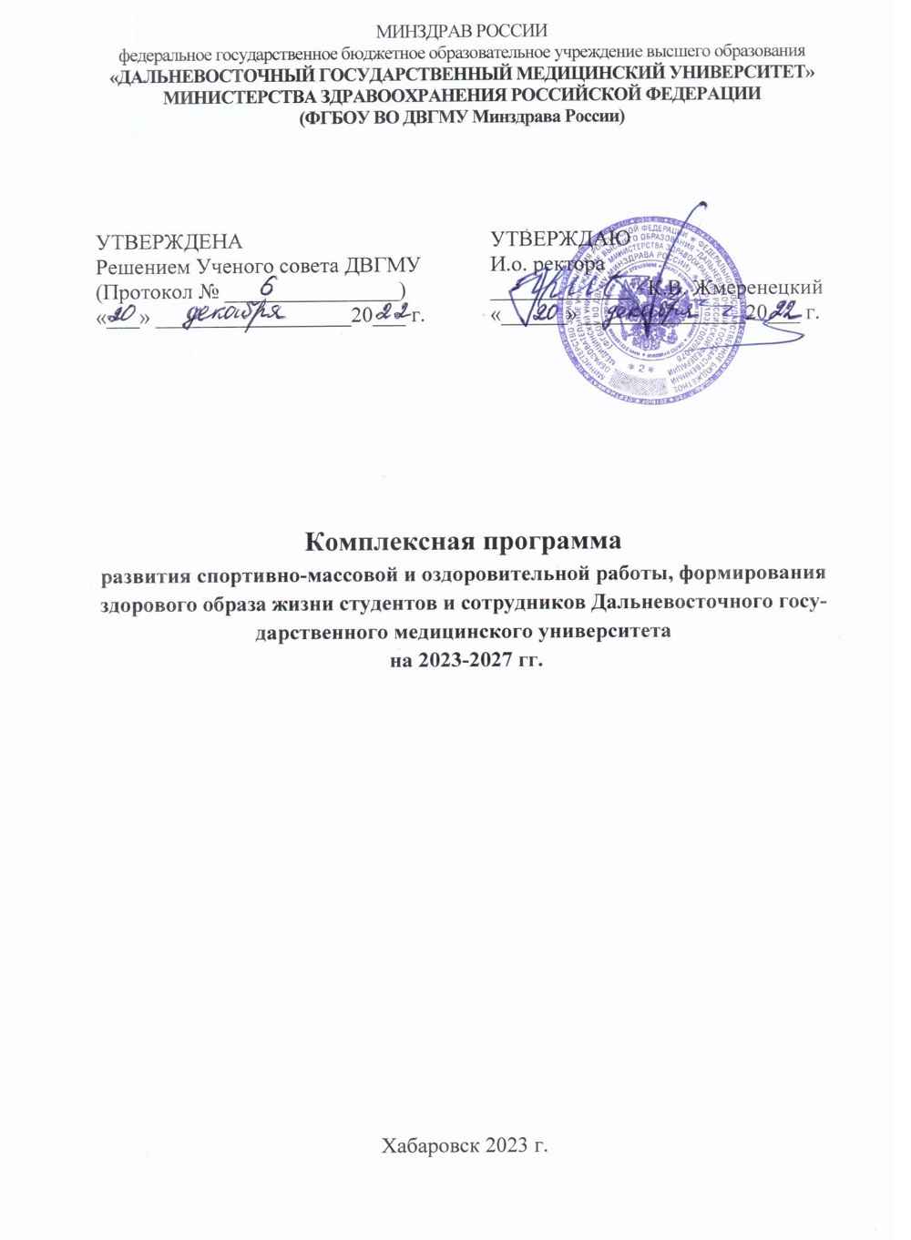 Во исполнение Федерального закона РФ от 23 февраля 2013 г. № 15-ФЗ «Об охране здоровья граждан от воздействия окружающего табачного дыма и последствий потребления табака», а также в целях повышения культуры поведения, пожарной безопасности, снижения вредного воздействия табачного дыма на здоровье обучающихся, сотрудников и преподавателей 07.06.2013 издан приказ ректора ДВГМУ «О запрещении курения» № 209. Большая работа проводится коллективом ДВГМУ в сфере формирования здорового образа жизни и профилактики вредных привычек. Ректором Жмеренецким К.В. совместно с кафедрой «Физическое воспитание и здоровье» организовано еженедельное мероприятие «Здоровая среда», где сотрудники университета, студенты во главе с ректором проводят товарищеские матчи по волейболу.